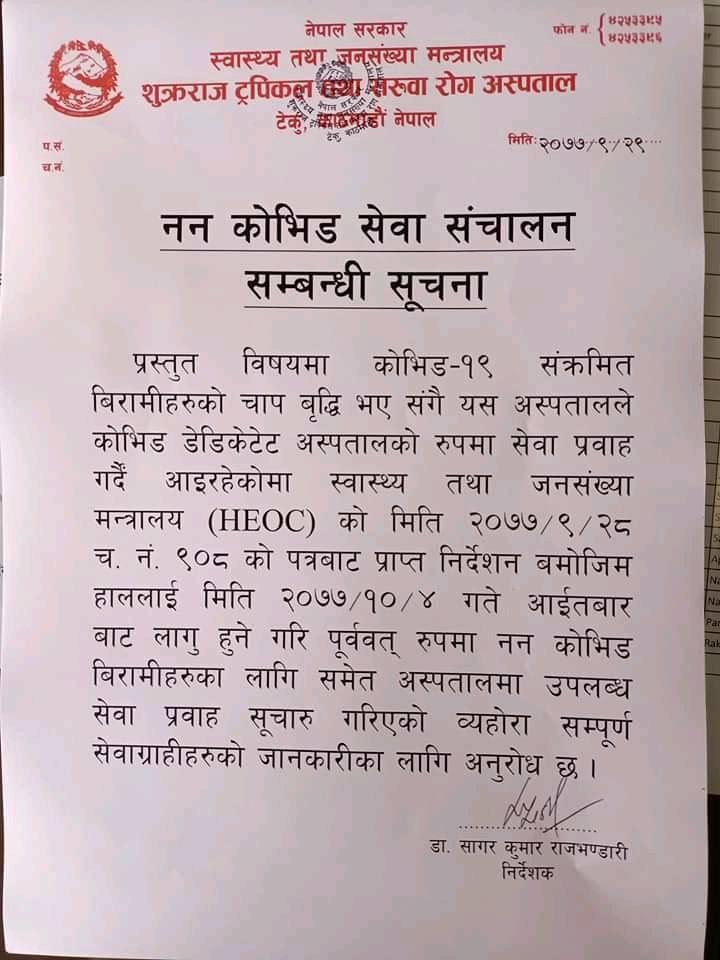 बुधवार एक विज्ञप्ति जारी गर्दै अस्पतालका निर्देशक डा. सागर कुमार राजभण्डारीले पूर्ववत् रुपमा नै नन कोभिड सेवा सञ्चालन गर्न लागेको जानकारी दिए ।