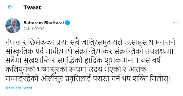 “नेपाल र छिमेकका प्राय: सबै जातिरसमुदायले उत्साहसाथ मनाउने सांस्कृतिक पर्व माघी/माघे संक्रान्ति/मकर संक्रान्तिको उपलक्ष्यमा सबैमा सुखशान्ति र समृद्धिको हार्दिक शुभकामना । यस बर्ष कलियुगको भष्मासुरको रूपमा उदय भएको र आतंक मच्चाइरहेको ओलीसुर प्रवृत्तिलाई परास्त गर्न थप शक्ति मिलोस् !”, पूर्वप्रधानमन्त्री समेत रहेका भट्टराईले लेखेका छन् ।
