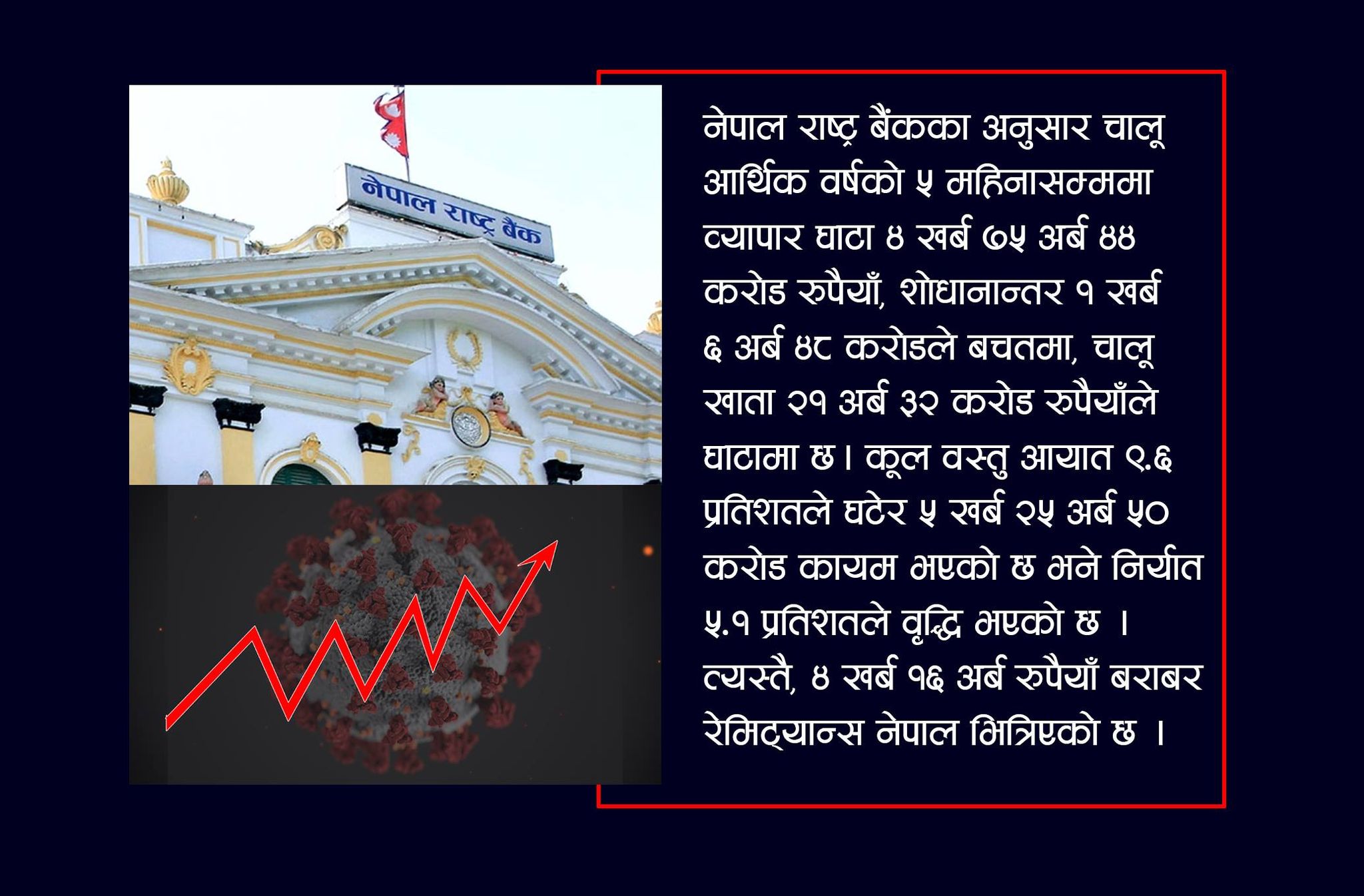 काठमाडौं । कोरोना भाइरस ‘कोभिड १९’का कारण मुलुकको अर्थतन्त्रमा नकारात्मक असर परिरहेका बेला नेपाल राष्ट्र बैंकले चालू आर्थिक वर्षको पाँच (मङ्सिर) महिनासम्मको मुलुकको अर्थतन्त्र सम्बन्धी विवरण सार्वजनिक गरेको छ ।