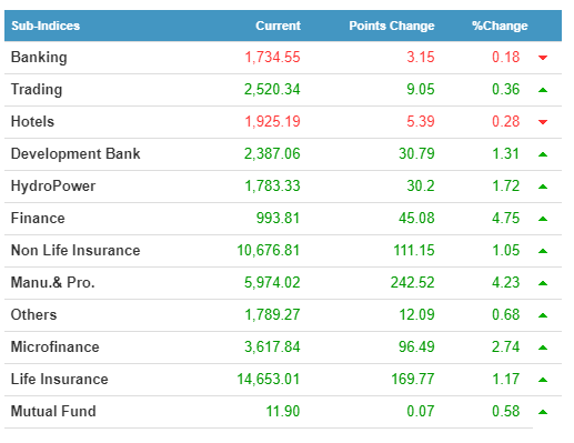 यस दिन सबैभन्दा बढी वित्त कम्पनीहरुको कारोबार भएको छ । वित्त कम्पनीहरुको कारोबार ४.७५ प्रतिशतले वृद्धि भएको छ ।