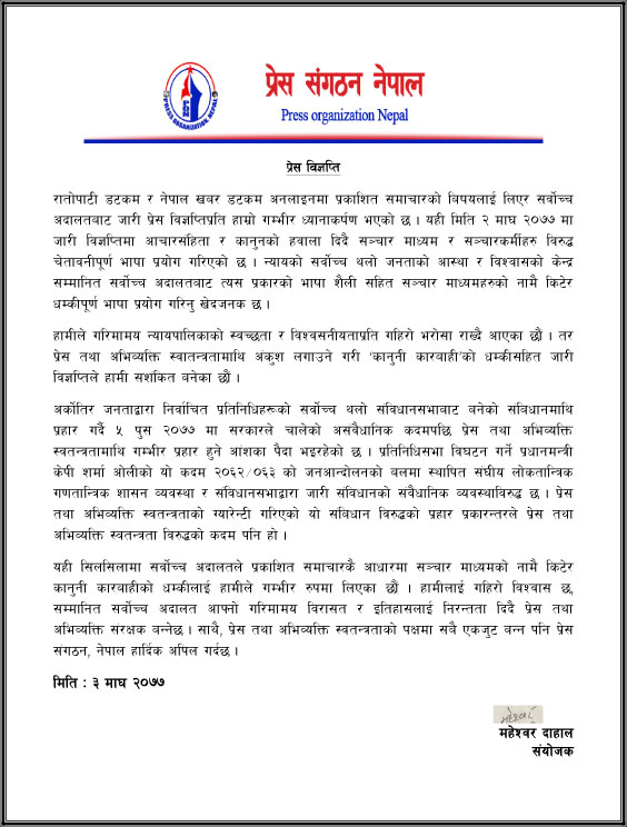 काठमाडौं । रातोपाटी डटकम र नेपाल खबर डटकम अनलाइनमा प्रकाशित समाचारलाई लिएर सर्वोच्च अदालतबाट जारी प्रेस विज्ञप्तिप्रति प्रेस संगठन नेपालले गम्भीर ध्यानाकर्षण गरेको छ । यही माघ २ गते शुक्रवार सर्वोच्चद्वारा जारी प्रेस विज्ञप्तिप्रति प्रेस संगठन नेपालले आपत्ति जनाएको हो ।