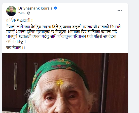कांग्रेस महामन्त्री शशांक कोइरालाले सामाजिक सञ्जाल मार्फत जानकारी दिँदै श्रद्धान्जली व्यक्त गरेका छन् । साथै शोकाकुल परिवारप्रति समवेदना प्रकट गरेका छन् ।