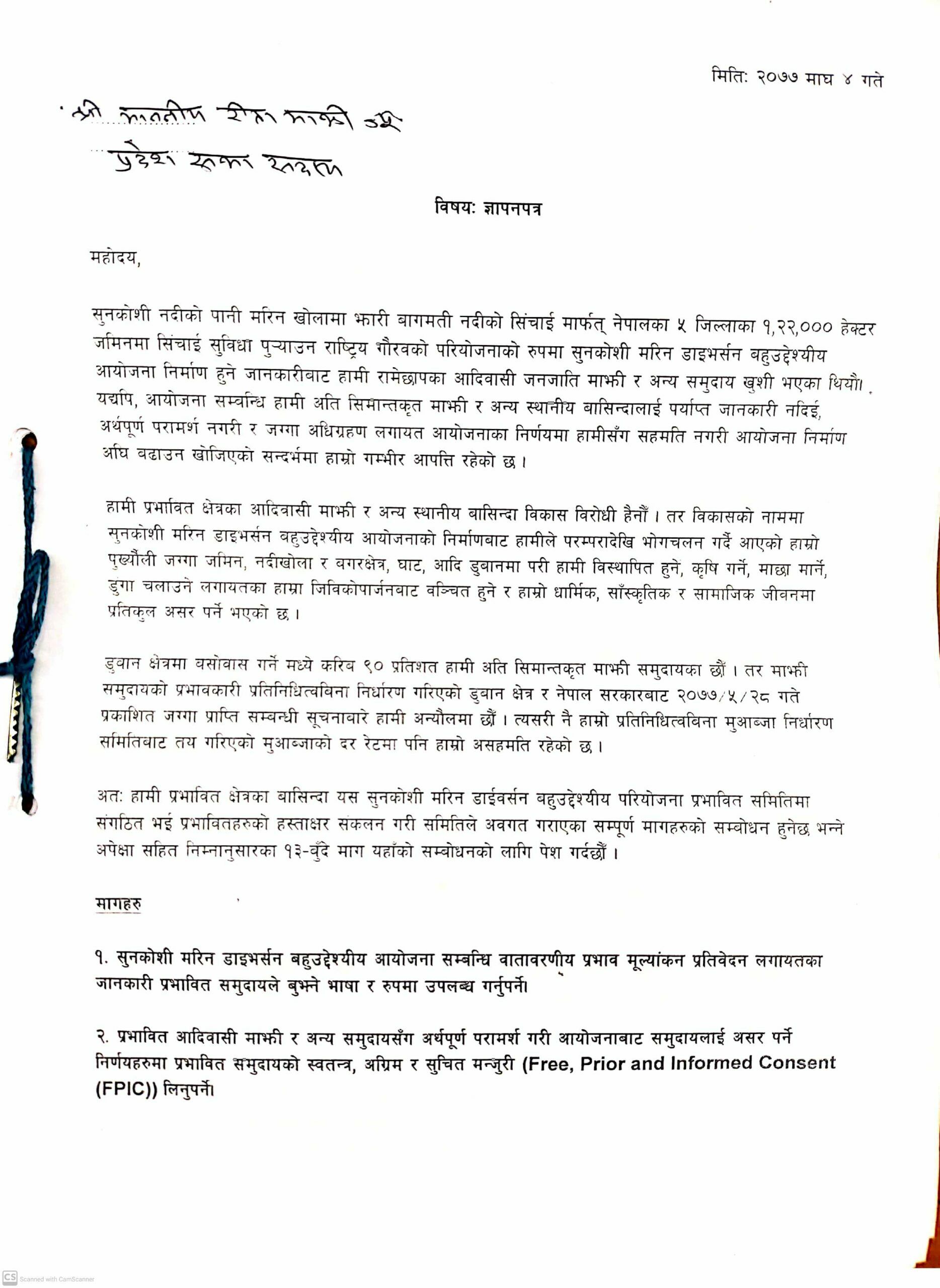 रामेछाप । सुनकोसीको पानी डाइभर्सन गरी सिन्धुलीको मरिण क्षेत्रमा लैजाने परियोजनामा रामेछापका प्रभावित माझी समुदायले १३ बुँदे मागसहित रामेछापका प्रमुख जिल्ला अधिकारी (सिडियो) अर्जुन कुमार शर्मा समक्ष ज्ञापनपत्र बुझाएका छन्।