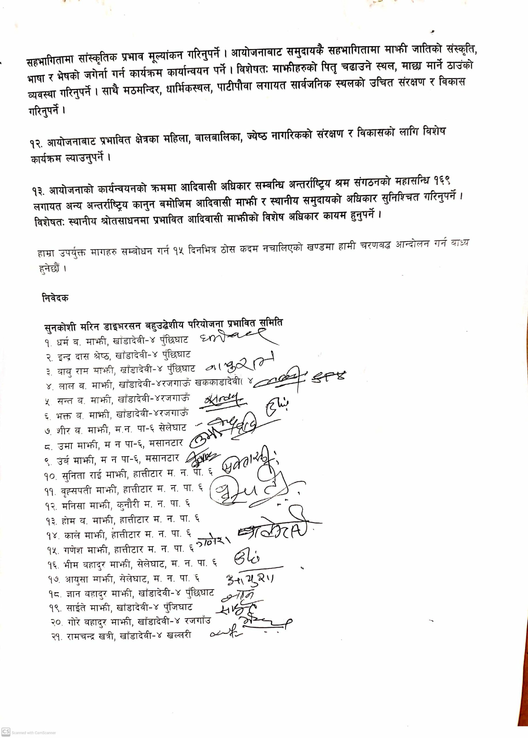 ज्ञापनपत्रमा लेखिएको छ, “डुबान क्षेत्रमा बसबास गर्ने मध्ये ९० प्रतिशत हामी अति सिमान्तकृ माझी समुदायका छौँ । तर माझी समुदायको प्रभावकारी प्रतिनिधित्व बिना निर्धारण गरिएको डुबान क्षेत्र र नेपाल सरकारबाट २०७७।०५।२८ गते प्रकाशित जग्गा प्राप्ति सम्बन्धी सूचनाबारे हामी अन्यौलमा छौँ । त्यसरी नै हाम्रो प्रतिनिधित्वबिना मुआब्जा निर्धारण समितिबाट तय गरिएको मुआब्जाको दररेटमा पनि हाम्रो असहमति रहेको छ ।”