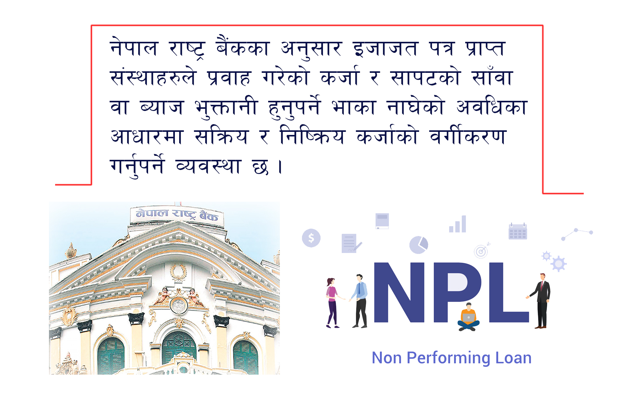 काठमाडौं – सामान्यतया बैंक तथा वित्तीय संस्थाहरुले लगानी गरेका असल तथा सुक्ष्म निगरानीमा रहेका कर्जालाई सक्रिय कर्जा र भाका नाघेका कर्जालाई निष्कृय कर्जा भनिन्छ ।