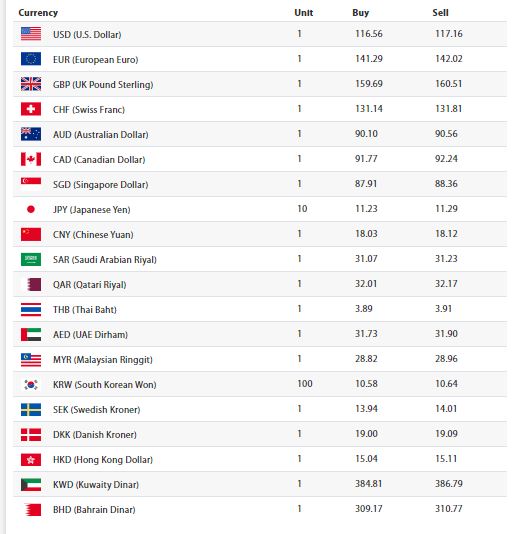 काठमाडौँ । नेपाल राष्ट्र बैंकले आज बिहिवारका लागि विदेशी मुद्राको विनिमयदर सार्वजनिक गरेको छ । सार्वजनिक दरअनुसार अमेरिकी डलर एकको खरिद मुल्य ११६ रुपैंया ५६ पैसा र बिक्री मुल्य ११७ रुपैंया १६ पैसा तोकिएको छ । राष्ट्र बैंकले युरोपियन युरो एकको खरिद मुल्य १४१ रुपैंया २९ पैसा र बिक्री मुल्य १४२ रुपैंया २ पैसा तोकेको छ।