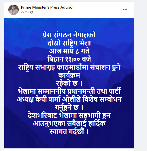 उक्त भेलालाई प्रधानमन्त्री केपी शर्मा ओलीले विशेष सम्बोधन गर्ने प्रधानमन्त्रीका प्रेस सल्लाहकार सुर्य थापाले जानकारी दिए ।