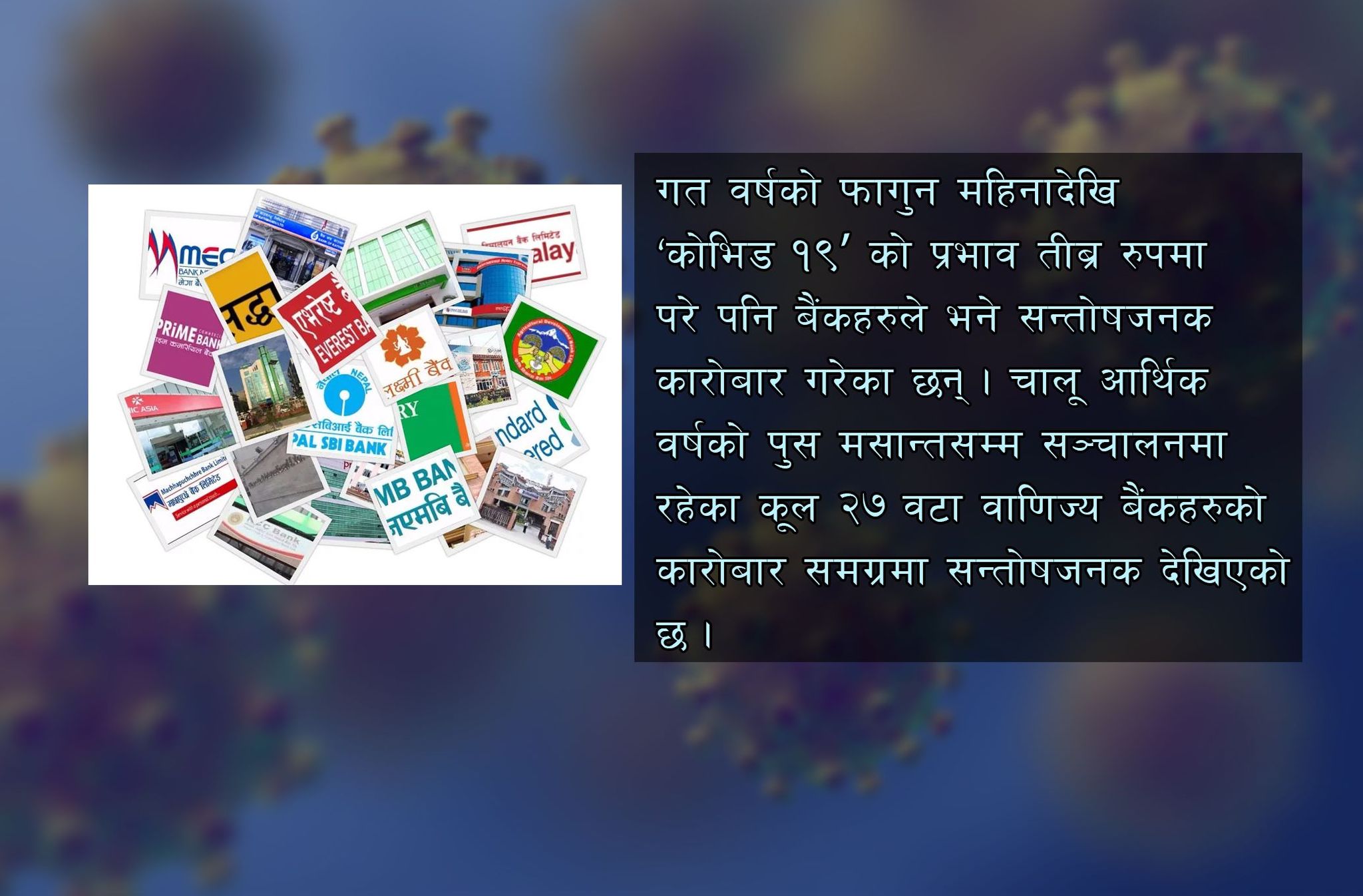 काठमाडौँ – गत वर्षको फागुन महिनादेखि कोरोना भाइरस ‘कोभिड – १९’ को प्रभाव तिव्र रुपमा परेपनि बैंकहरुले भने सन्तोषजनक कारोबार गरेका छन् ।