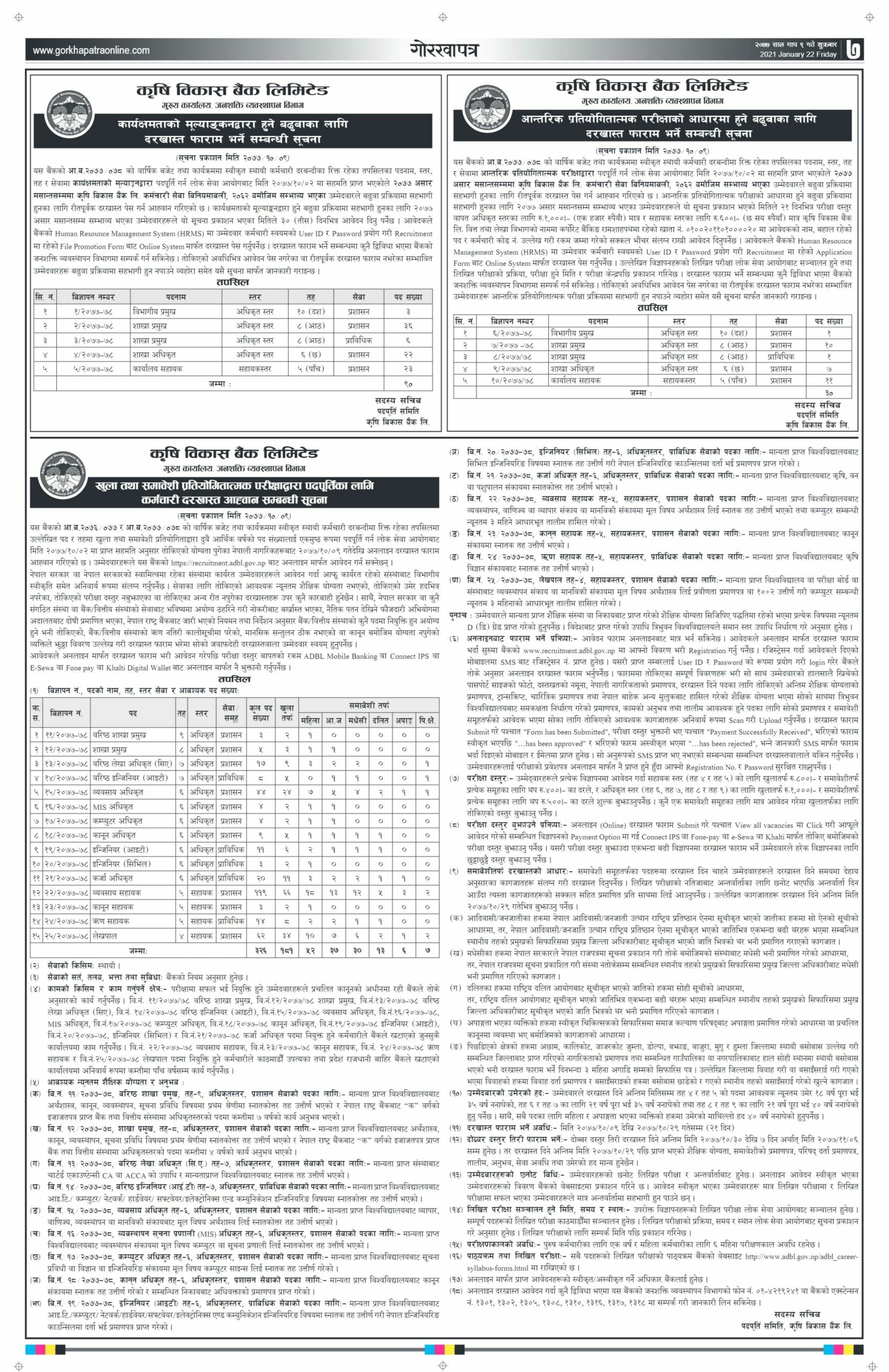 काठमाडौँ । कृषि विकास बैंकले विभिन्न पदमा ३ सय २६ जनाका लागि दरखास्त आह्वान गरेको छ । बैंकले आज गोरखापत्रमा विज्ञापन प्रकाशित गर्दै प्रशासन र प्राविधिक दुबै तर्फबाट ठूलो संख्यामा कर्मचारी माग गरेको हो ।