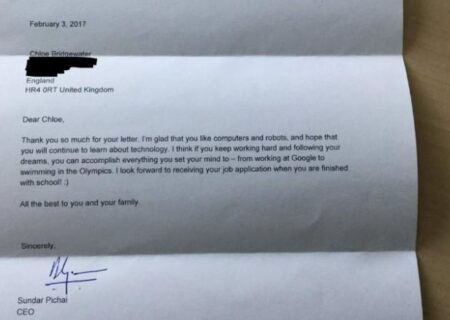 सीईओ सुन्दर पिचाइले बालिकालाई पत्रमार्फत् भविष्यमा अध्ययन राम्रो भएमा जागिर दिने आश्वासन दिएका छन् । पत्रमा उनले लेखेका छन् ’यदि तिमीले मिहनेतसाथ अध्ययन ग¥यौ भने गूगलमा काम गर्न सक्छौं, तिम्रो स्कूलको पढाइ सकिएसँगै म तिम्रो जब एप्लिकेशनको प्रतिक्षामा रहनेछु।’