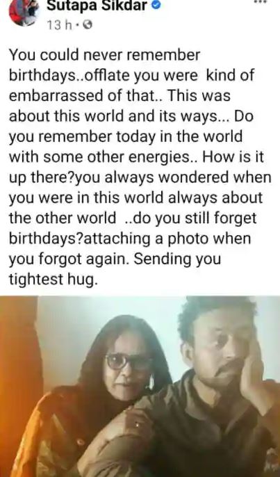 सुतापाले आफ्नो जन्मदिनमा इरफानलाई याद गर्दै इमोशनल नोट लेखेकी छन् । अभिनेता इरफानको निधन २९ अप्रिल २०२० मा भएको थियो ।