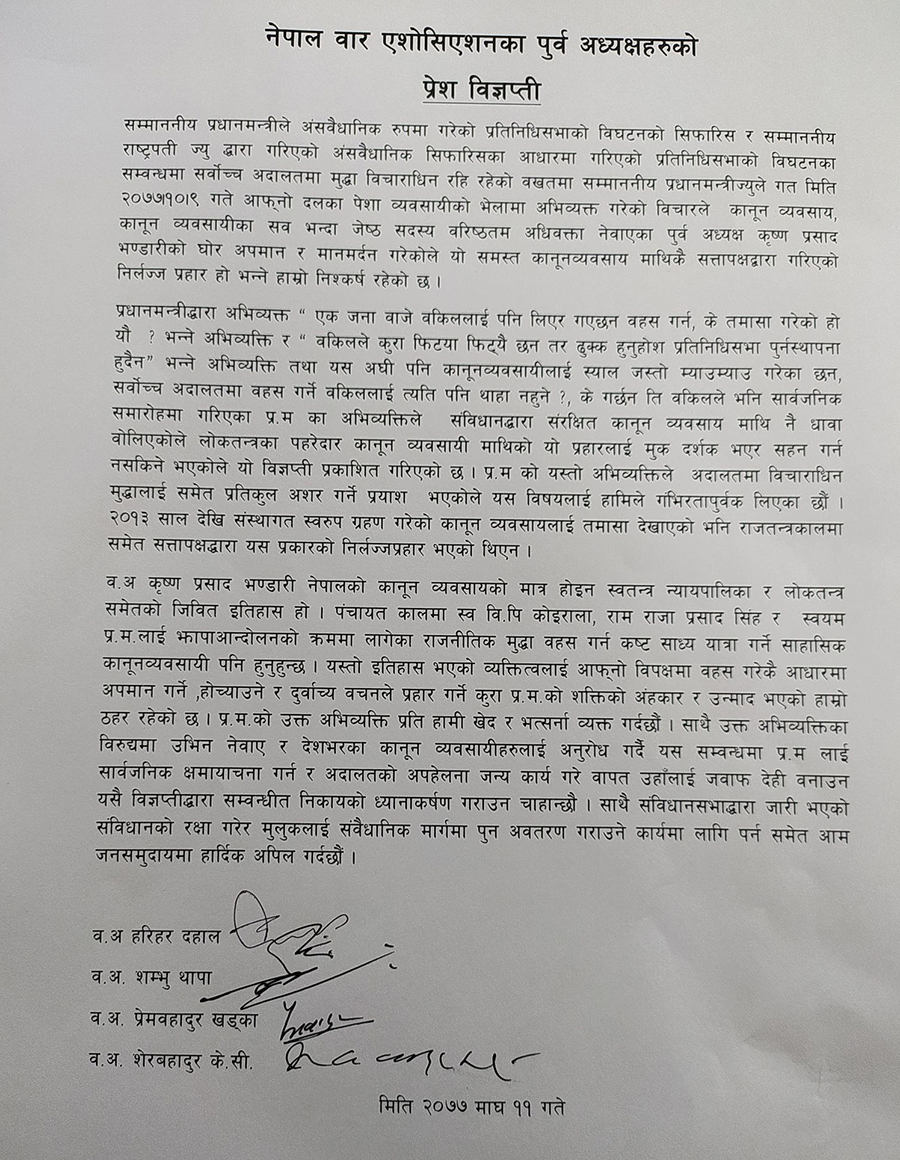 “सर्वोच्च अदालतमा मुद्दा विचाराधिन रहि रहेको बखतमा सम्माननीय प्रधानमन्त्रीज्यूले गत मिति २०७७/१०/०९ गते आफ्नो दलका पेशा व्यवसायीको भेलामा अभिव्यक्त गरेको विचारले कानून व्यवसाय, कानून व्यवसायका सबभन्दा जेष्ठ सदस्य वरिष्ठतम अधिवक्ता नेवाएका पूर्व अध्यक्ष कृष्ण प्रसाद भण्डारीको घोर अपमान र मान मर्दन गरेकोले यो समस्त कानून व्यवसाय माथिकै सत्तापक्षद्वारा गरिएको निर्लज्ज प्रहार हो भन्ने हाम्रो निष्कर्ष रहेको छ ।” जारी विज्ञप्तिमा भनिएको छ ।