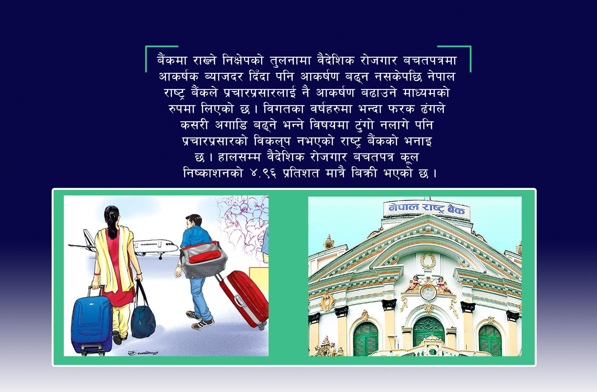 राष्ट्र बैंकले वैदेशिक रोजगार बचतपत्रको बारेमा वैदेशिक रोजगारीमा जानेलाई बुझाउन पर्याप्त कसरत गर्न सकेको छैन । त्यसकारण यस रोजगार बचतपत्रमा आकर्षण बढ्न सकेको छैन । राष्ट्र बैंकले बचतपत्रको प्रचार प्रसारका लागि डेपूटी गभर्नर शिवाकोटीको नेतृत्वमा एक टोली बनाई तीन/चार वर्षअघि खाडी मुलुक पठाएको थियो ।