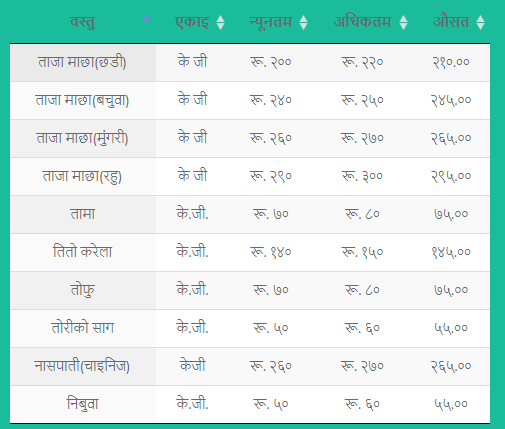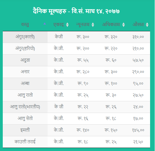 जसअनुसार कालो अंगुरको प्रतिकेजी मूल्य ३१० रुपैयाँ, हरियो अंगुरको प्रतिकेजी मूल्य २१० रुपैयाँ, अनारको प्रतिकेजी मूल्य २९० रुपैयाँ, रातो आलु प्रतिकेजी मूल्य २७ रुपैयाँ ५० पैसा रहेको छ ।