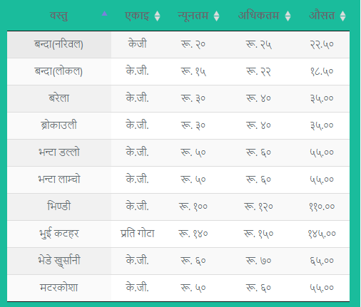 त्यस्तै स्थानीय काउलीको प्रतिकेजी मूल्य २५ रुपैयाँ, केरा प्रति दर्जन ९५ रुपैयाँ, खुर्सानी सुकेको प्रतिकेजी मूल्य ३२५ रुपैयाँ रहेको समितिले जनाएको छ ।