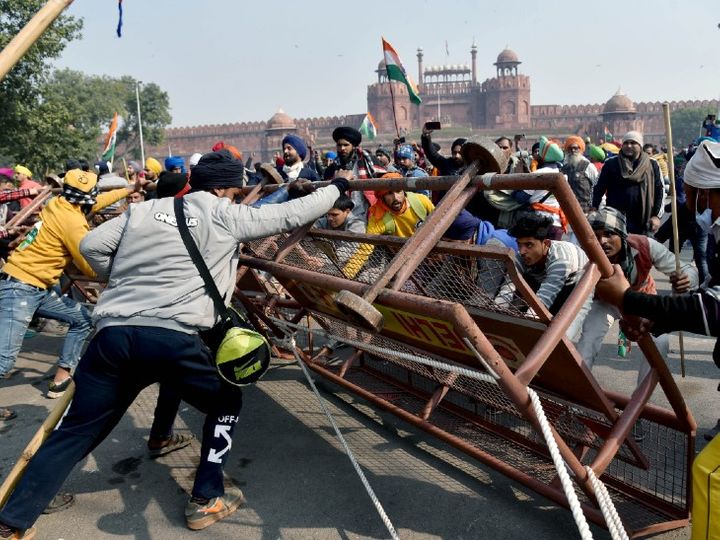 #WATCH | A protesting farmer died after a tractor rammed into barricades and overturned at ITO today: Delhi Police