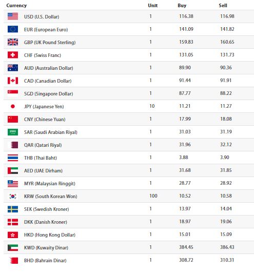 काठमाडौँ । नेपाल राष्ट्र बैंकले आज बिहीवारका लागि विदेशी मुद्राको विनिमयदर सार्वजनिक गरेको छ । राष्ट्र बैंकले आज अमेरिकी डलर एकको खरिददर ११६ रुपैयाँ ३८ पैसा र बिक्रीदर ११६ रुपैयाँ ९८ पैसा निर्धारण गरेको छ ।