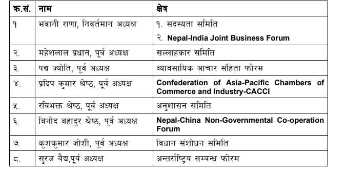 जसअनुसार भवानी राणालाई सदस्य समिति, महेशलाल प्रधानलाई सल्लाहकार समिति, पद्य ज्योतीलाई व्यवसायीक आचारसंहिता फोरममा जिम्मेवारी दिइएको हो ।
