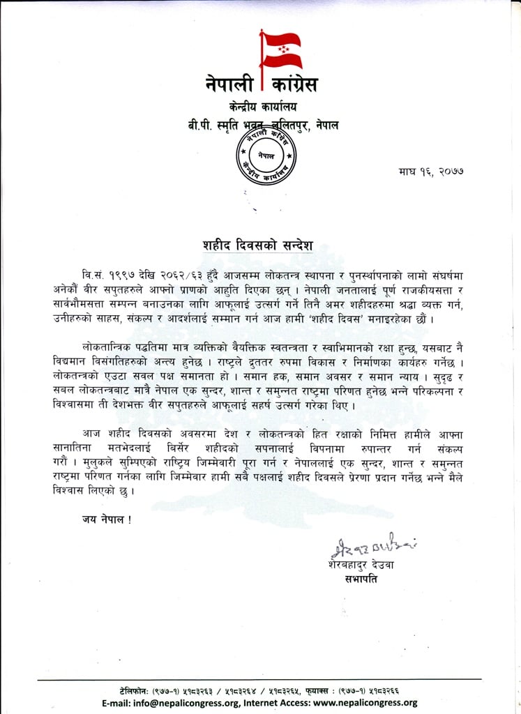 “आज शहीद दिवसको अवसरमा देश र लोकतन्त्रको हित रक्षाको निमित्त हामीले आफ्ना सानातिना मतभेदलाई बिर्सेर शहीदको सपनालाई विपनामा रुपान्तर गर्न संकल्प गरौँ ।” सभापति देउवाले भने, “मुलुकले सुम्पिएको राष्ट्रिय जिम्मेवारी पूरा गर्न र नेपाललाई एक सुन्दर, शान्त र समुन्नत राष्ट्रमा परिणत गर्नका लागि जिम्मेवार हामी सबै पक्षलाई शहीद दिवसले प्रेरणा प्रदान गर्नेछ भन्ने मैले विश्वास लिएको छु ।”