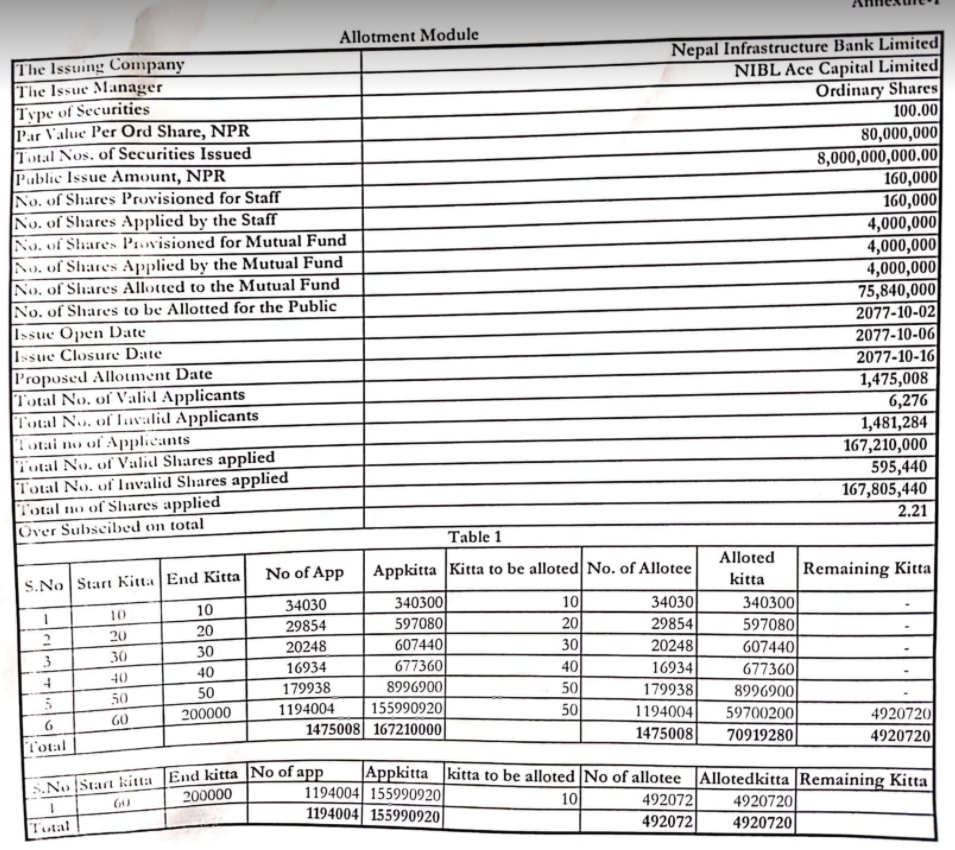 क्यापिटलका अनुसार निफ्राको आईपीओ १४ लाख ७५ हजार ८ जनाले प्राप्त गरेका छन् । १० देखि ५० कित्ता शेयर माग गर्नेलाई माग अनुसार नै शेयर वितरण गरिने भएको क्यापिटलले जनाएको छ। यस्तै ६० कित्तादेखि २ लाख कित्तासम्म माग गर्नेलाई ५० कित्ता अनिवार्य र थप १० कित्ता शेयर बाँडफाँड गरिएको छ ।