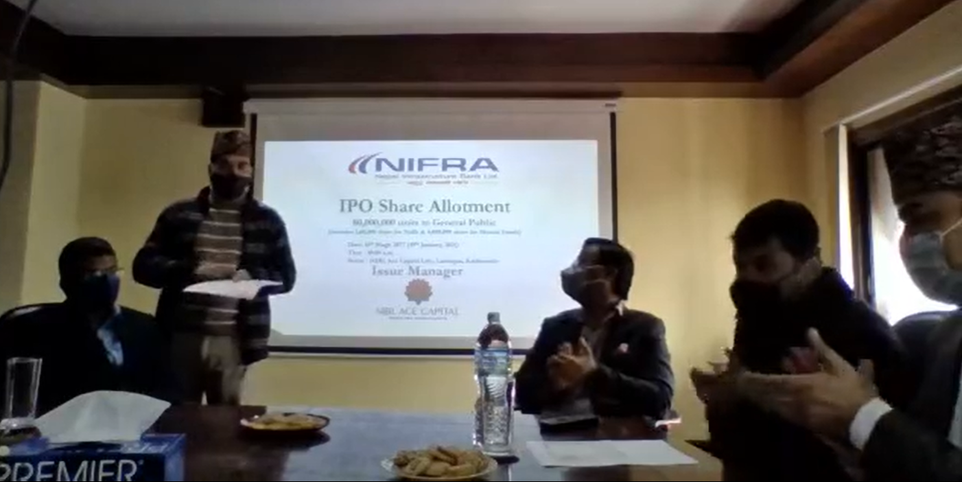 निफ्राको आईपीओ निष्काशन तथा बिक्री प्रबन्धक एनआईबीएल एस क्यापिटलको कार्यालयमा शुक्रवार (आज) बाँडफाँड आइपीओ बाँडफाँड भएको हो।