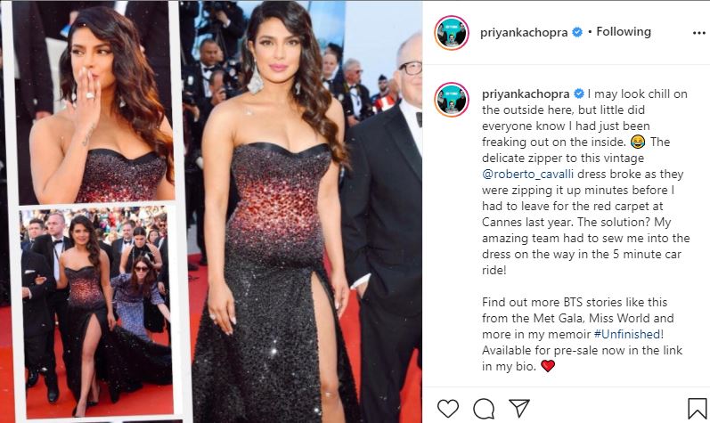 प्रियंकाले भनेकी छन्, जुन ड्रेस उनले रेड कार्पेटमा लगाएकी थिइन्, त्यो ड्रेसको चेन लास्ट मोमेन्टसम्म बिग्रिसकेको थियो । फेरि टीमले गाडिमा जाँदै गर्दा सिलाइदियो ।