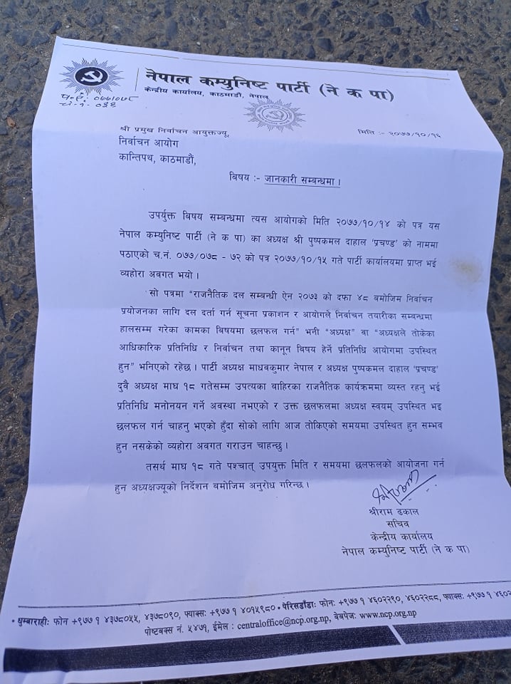 “पत्रमा राजनीतिक दलसँग सम्बन्धी ऐन ७३ को दफा ४८ बमोजिम निर्वाचन प्रयोजनका लागि दल दर्ता सूचना प्रकाशन र आयोगले निर्वाचन तयारीका सम्बन्धमा हालसम्म गरेका कामका विषयमा छलफल गर्न? भनी अध्यक्ष वा अध्यक्षले तोकेका आधिकारिक प्रतिनिधि र निर्वाचन तथा कानून विषय हेर्ने आयोगमा उपस्थित हुनु भनिएको रहेछ । पार्टी अध्यक्ष माधवकुमार नेपाल र पुष्पकमल दाहाल प्रचण्ड दुवै अध्यक्ष माघ १८ गतेसम्म उपत्यका बाहिरका राजनीतिक कार्यक्रममा व्यस्त रहनु भई प्रतिनिधि मनोनयन गर्ने अवस्था नभएको र उक्त छलफलमा अध्यक्ष स्वयम उपस्थित भइ छलफल गर्न चाहनु भएको हुँदा सोको लागि आज तोकिएको समयमा सम्भव नभएको कुरा अवगत गराउँदछौँ ।” पत्रमा भनिएको छ, “तसर्थ माघ १८ गते पश्चात उपयुक्त मिति र समयमा छलफलको आयोजना गर्न अध्यक्षज्यूको निर्देशन बमोजिम आग्रह गरिन्छ ।”