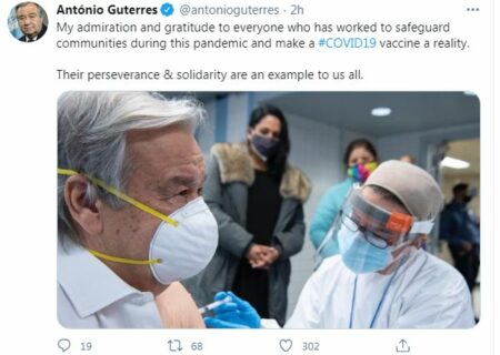 गुटेर्रेसले आफ्नो ट्वीटरमार्फत आफू भाग्यशाली र कृतज्ञ भएको बताउँदै सो कुराको जानकारी गराएका हुन् । साथै उनले अन्तर्राष्ट्रिय समुदायलाई यो पनि खोप सबैको लागि यथोचित रुपमा उपलब्ध गराउन लागि सुनिश्चित गर्नुपर्ने बताएका छन् ।