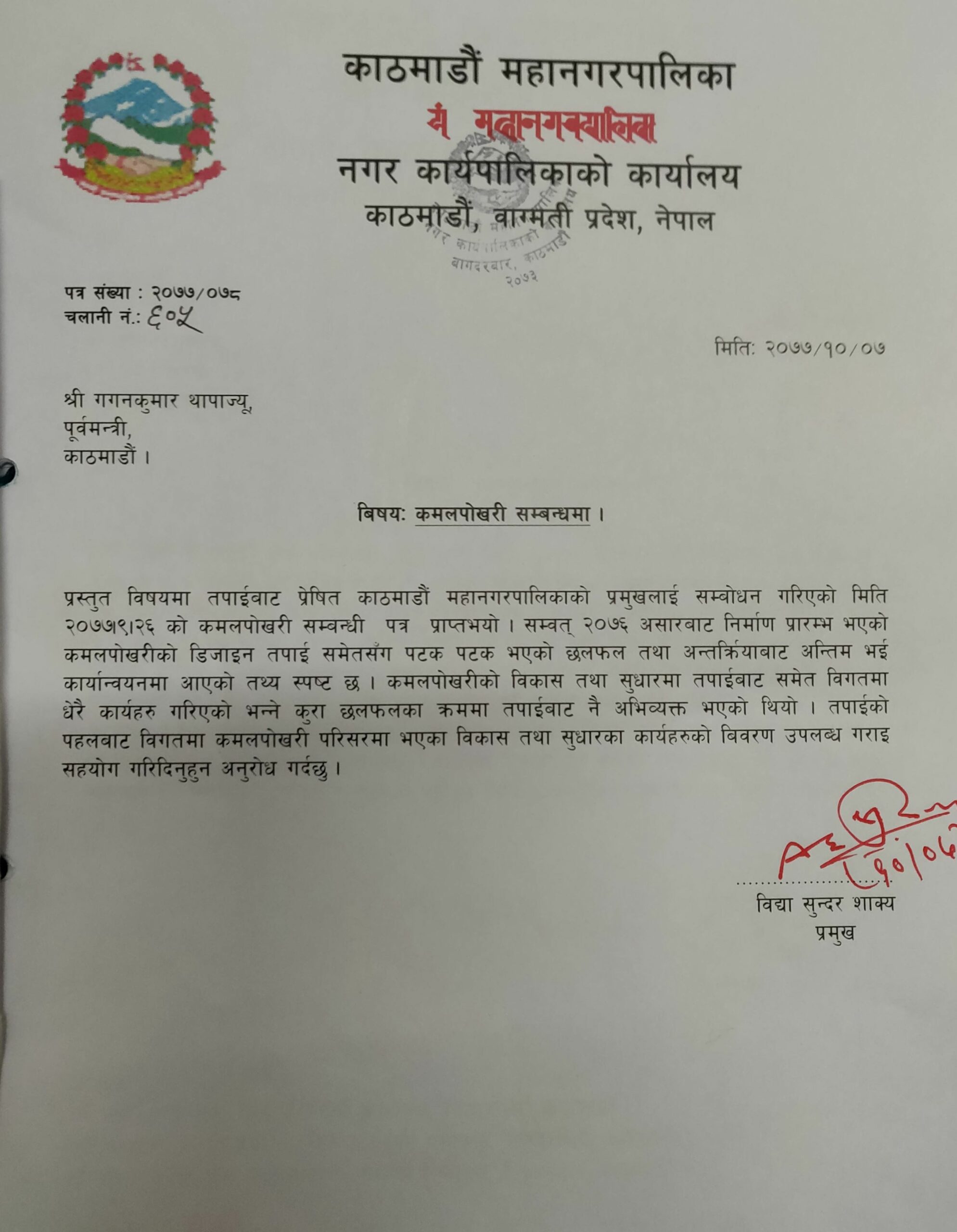 त्यसैगरी काठमाडौं ममानगरपालिकाका प्रमुख विद्या सुन्दर शाक्यले पनि तत्कालिन संघीय सांसद गगन कुमार थापालाई समेत पत्र लेखी कमलपोखरीको विकास तथा सुधारका लागि उनले गरेका कार्यको विवरण उपलब्ध गराई सहयोग गरिदिन आग्रह गरेका छन् । ‘कमल पोखरी पुर्नर्निमाणका सन्दर्भमा तपाईँबाट प्रषित काठमाडौं महानगरपालिकाको प्रमुखलाई सम्वोधन गरिएको मिति २०७७÷०९÷२६को पत्र प्राप्त भयो,’ पत्रमा भनिएको छ, ‘सम्वत् २०७६ असारबाट निर्माण प्रारम्भ भएको कमलपोखरीको डिजाइन तपाईँसमेतसँग पटक–पटक भएको छलफल तथा अन्तरक्रियाबाट अन्तिम भई कार्यान्वयनमा आएको प्रष्ट छ । पोखरीको विकास तथा सुधारमा तपाईँबाट समेत विगतमा धेरै कार्यहरु गरिएको भन्ने छलफलका क्रममा तपाईँबाट नै अभिव्यक्त भएको थियो । तपाईको पहलबाट विगतमा कमलपोखरी परिसरमा भएका विकास तथा सुधारका कार्यहरुको विवरण उपलब्ध गराई सहयोग गरिदिनुहुन अनुरोध छ ।’