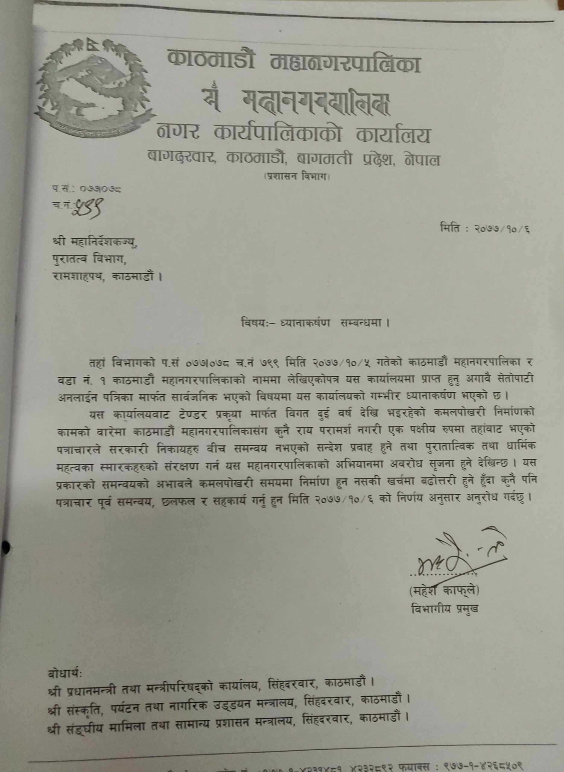 काठमाडौं महानगरपालिकाका प्रशासन विभाग प्रमुख महेश काफ्लेले पुरातत्व विभागलाई पत्र नै पठाएर ध्यानाकर्षण गराएका हो। कमलपोखरी पुनर्निर्माणका सन्दर्भमा पछिल्लो समय देखिएको विवादको विषयमा पुरातत्व विभागले महानगरपालिकासँग समन्वय नै नगरी महानगरपालिकालाई पठाएको भनिएका पत्र एकपक्षीय रुपमा पहिल्यै विभिन्न सञ्चारमाध्ययमलाई उपलब्ध गराएको महानपालिकाको आरोप छ ।