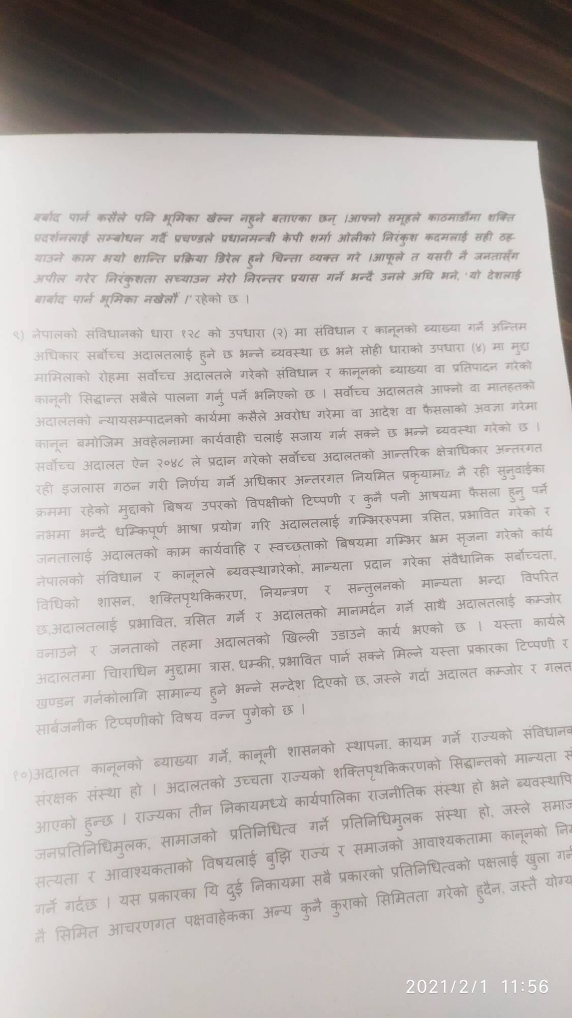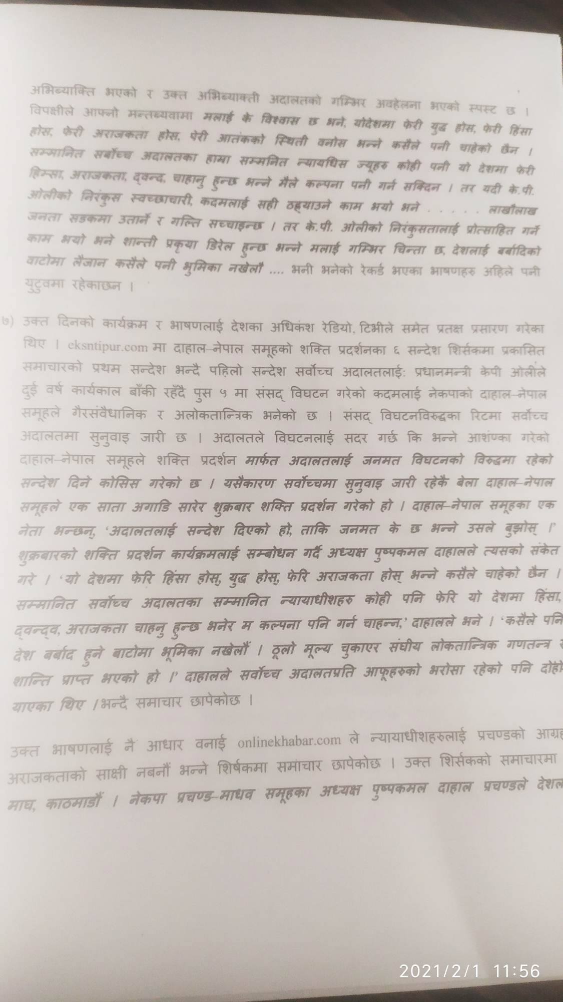 प्रचण्डले अदालत र न्यायाधीशहरुमाथि लक्षित गर्दै धम्कीपूर्ण अभिव्यक्ति दिएको दाबीसहित सर्वोच्चमा निवेदन दर्ता गरिएको हो । निवेदनमा प्रचण्डविरुद्धमा १ वर्षको जेल सजाय र १० हजार जरिवानाको समेत माग गरिएको छ ।