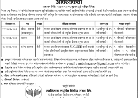 काठमाडौं । स्वाभिमान लघुवित्तले विभिन्न पदको लागि कर्मचारी माग गरेको छ। लघुवित्तले बरिष्ठ सहायक, सहायक र कनिष्ट सहायक पदको लागिकर्मचारी माग गरेको हो ।
