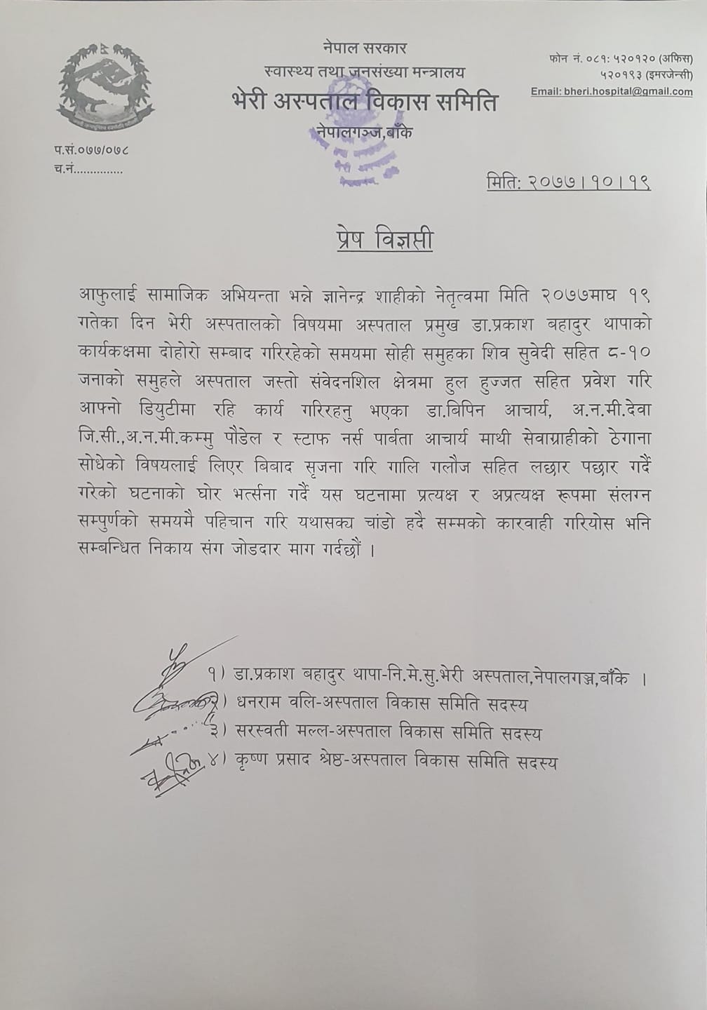 अस्पतालले एक विज्ञप्ति जारी गर्दै ज्ञानेन्द्र शाहीको समूहमा आएका ८/१० जनाको समूहले अस्पतालमा हुलहुज्जत गरी ड्यूटीमा रहेका डा विपिन आचार्य, अ.न.मी देवा जिसी, अ.न.मी कम्मु पौडेल तथा स्टाफ नर्स पार्वती आचार्यमाथि गालीगलौज तथा छलार पछार गरेको अस्पतालले जनाएको छ ।
