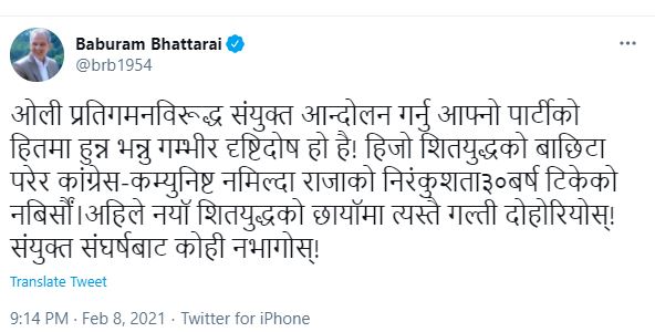 “ओली प्रतिगमनविरूद्ध संयुक्त आन्दोलन गर्नु आफ्नो पार्टीको हितमा हुन्न भन्नु गम्भीर दृष्टिदोष हो है! हिजो शितयुद्धको बाछिटा परेर कांग्रेस-कम्युनिष्ट नमिल्दा राजाको निरंकुशता ३० बर्ष टिकेको नबिर्सौं,”भट्टराईले लेखेका छन्, “अहिले नयाॅ शितयुद्धको छायाॅमा त्यस्तै गल्ती दोहोरियोस् ! संयुक्त संघर्षबाट कोही नभागोस् !”