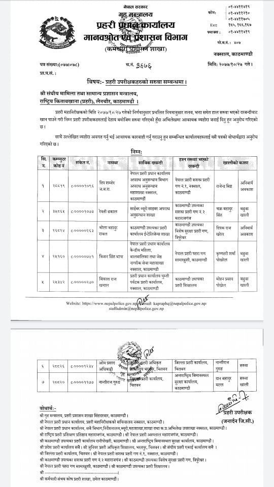 यस्तै अपराध अनुसन्धान विभाग अपराध अनुसन्धान महाशाखाका दीपशमशेर जबराको नेपाल प्रहरी सशस्त्र गण-१ नक्सालमा सरूवा भएको छ। साइबर ब्युरो का साइबर अपराध अनुसन्धान शाखाका रेवती ढकालको काठमाडौं उपत्यका सशस्त्र प्रहरी गण-२ महाराजगन्जमा भएको छ।