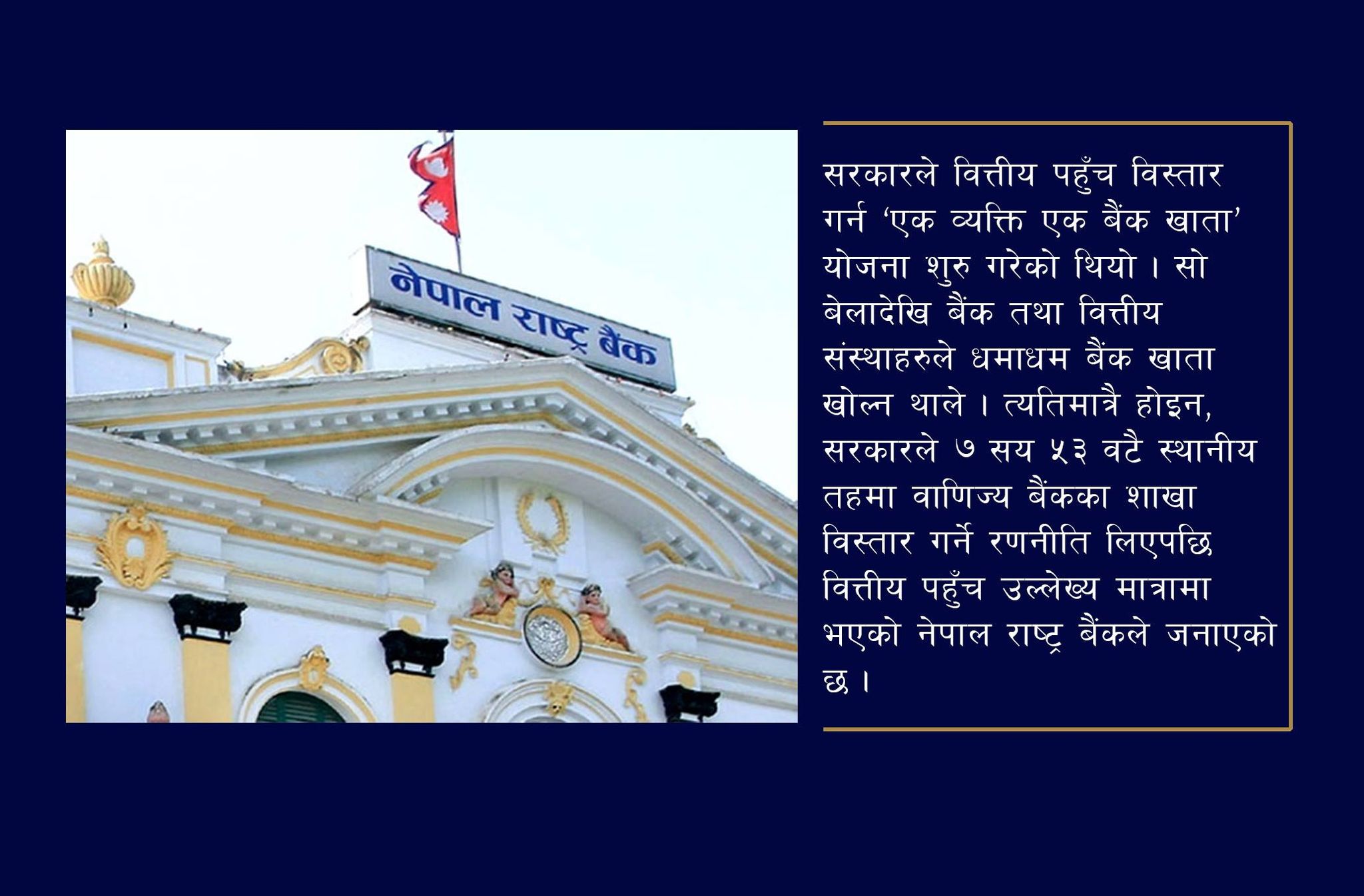 सरकारले वित्तीय पहुँच विस्तार गर्न ‘एक व्यक्ति एक बैंक खाता’ योजना शुरु गरेको थियो । सो बेलादेखि बैंक तथा वित्तीय संस्थाहरुले धमाधम बैंक खाता खोल्न थाले । त्यतिमात्रै होइन, सरकारले ७ सय ५३ वटै स्थानीय तहमा वाणिज्य बैंकका शाखा विस्तार गर्ने रणनीति लिएपछि वित्तीय पहुँच उल्लेख्य मात्रामा भएको नेपाल राष्ट्र बैंकका प्रवक्ता डा.गुणाकर भट्टले बताए । त्यस्तै, राष्ट्र बैंकले वित्तीय पहुँच विस्तारका लागि लिएको वित्तीय साक्षरताको नीतिका कारण पनि वित्तीय पहुँच उल्लेख्य रुपमा भएको राष्ट्र बैंकको भनाई छ ।