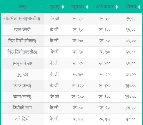 यस्तै ठूलो गोलभेंडा ५५ रुपैयाँ, टनेल गोलभेंडा प्रतिकेजी २० रुपैयाँ, सानो गोलभेंडा (तराई) २५ रुपैयाँ, गोलभेडा सानो (भारतीय) २५ रुपैयाँ, सुकेको खुर्सानी प्रतिकेजी ३२५ रुपैयाँ, गान्टे मुला प्रतिकेजी मूल्य ७५ रुपैयाँ निर्धारण गरिएको समितिले जनाएको छ । यस्तो छ पुरा मूल्य सूची: