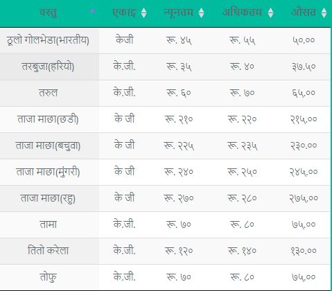 यसैगरी सेतो आलु १९ रुपैयाँ, रातो र भारतीय रातो आलुको मूल्य २६ रुपैयाँ, तराई काउली २५ रुपैयाँ तथा स्थानीय काउली ४० रुपैयाँ तोकिएको छ ।