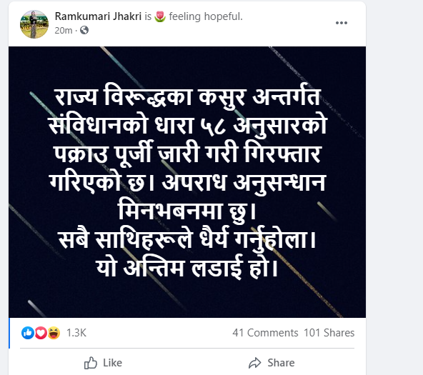 सामाजिक सञ्जालमा उनले लेखेकी छिन्- “राज्य विरूद्धका कसुर अन्तर्गत संविधानको धारा ५८ अनुसारको पक्राउ पूर्जी जारी गरी गिरफ्तार गरिएको छ। अपराध अनुसन्धान मिनभबनमा छु। सबै साथिहरूले धैर्य गर्नुहोला। यो अन्तिम लडाई हो।”