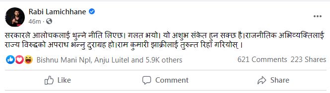 राम कुमारी झाँक्रीको पक्राउको बिषयलाई लिएर समाजिक सञ्जाल फेसबुकमा लामिछानेले, ‘सरकारले आलोचकलाई थुन्ने नीति लिएछ। गलत भयो। यो अशुभ संकेत हुन सक्छ है।राजनीतिक अभिव्यक्तिलाई राज्य विरुद्धको अपराध भन्नु दुराग्रह हो । राम कुमारी झाक्रीलाई तुरुन्त रिहा गरियोस् ।’
