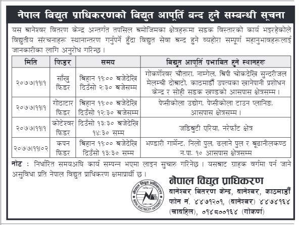 बानेश्वर बितरण केन्द्र अन्तर्गत शाँखु, गोठाटार, कपन र कोटेश्वर लगयातका ठाउँमा भोलि शनिवार र आइतवार विद्युत आपूर्ति बन्द हुने प्राधिकरणले जनाएको छ ।