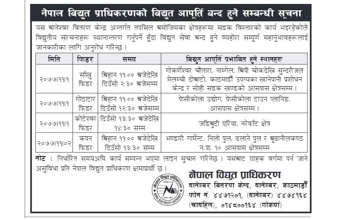यसैगरी कपन फिडरअन्तर्गत भोलि बिहान ११ बजेदेखि दिउँसो १ः३० बजेसम्म विद्युत कटौती हुने केन्द्रले जनाएको छ ।