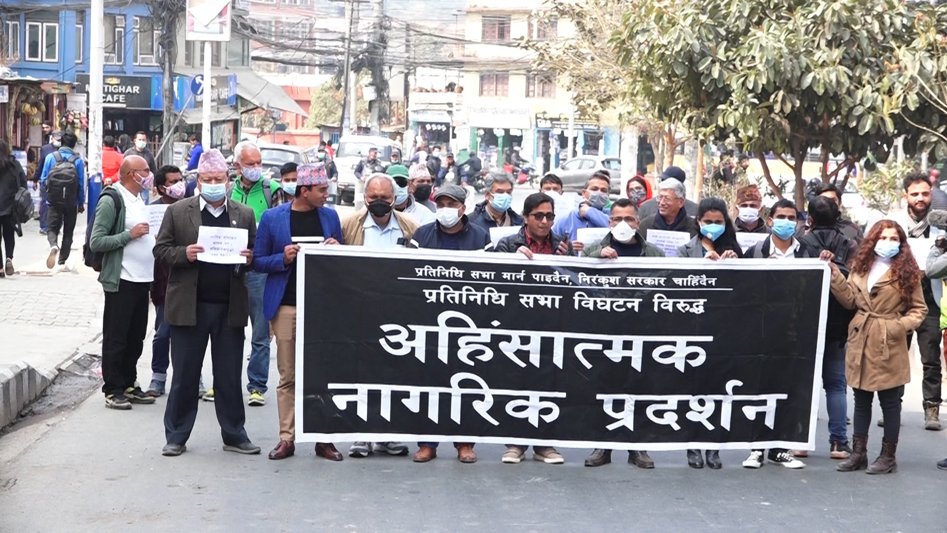 संबैधानिक निकायको कब्जा बन्द गर, संबैधानिक प्रणालीको सुरक्षा गर–राजद्रोहीलाई कारवाही गर, लगायत नारा लेखिएका पर्चा सहित उपस्थित नागरिक समाजका प्रतिनिधिले प्रतिनिधिसभा विघटन गर्ने प्रधानमन्त्रीको कदमको विरोध गरेका थिए । प्रर्दशनमा केदारनरसिंह केसी, डाक्टर गोविन्द केसी, नारायण वाग्ले लगायतको उपस्थिति थियो ।