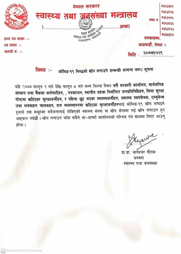 सरकारले माघ १४ गतेदेखि कोरोनाबिरुद्धको खोप अभियान सुरु गरेको थियो । पहिलो चरणमा कोरोना महामारीबिरुद्ध खटिएका फ्रन्टलाइनर कर्मचारीलाई खोप दिइएको थियो ।