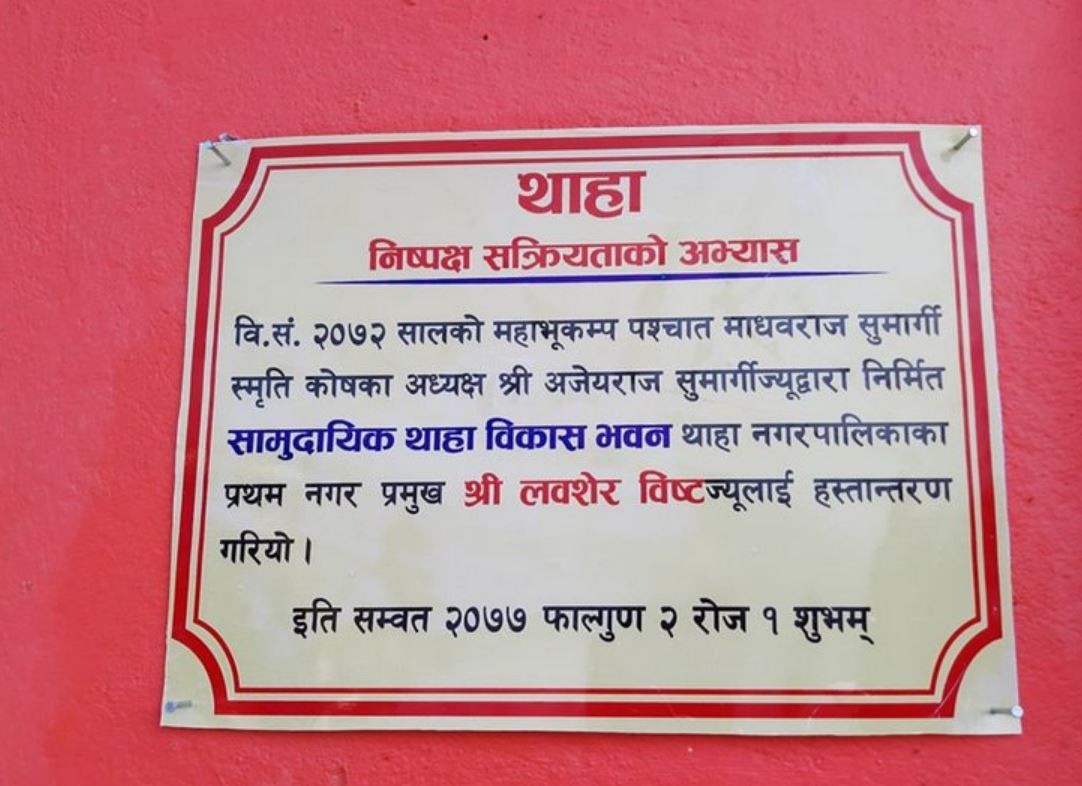 काठमाडौँ– मकवानपुरको थाहा नगरपालिका ६ मा रहेको ‘सामुदायिक थाहा विकास भवन’ आज एक समारोहबीच हस्तान्तरण गरिएको छ ।