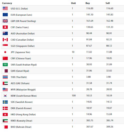 काठमाडौं । नेपाल राष्ट्र बैंकले आज बुधवारका लागि विदेशी मुद्राको विनिमयदर सार्वजनिक गरेको छ । सार्वजनिक दरअनुसार आज अमेरिकी डलर एकको खरिददर ११६ रुपैयाँ र बिक्रीदर ११६ रुपैयाँ ६० पैसा तोकिएको छ ।