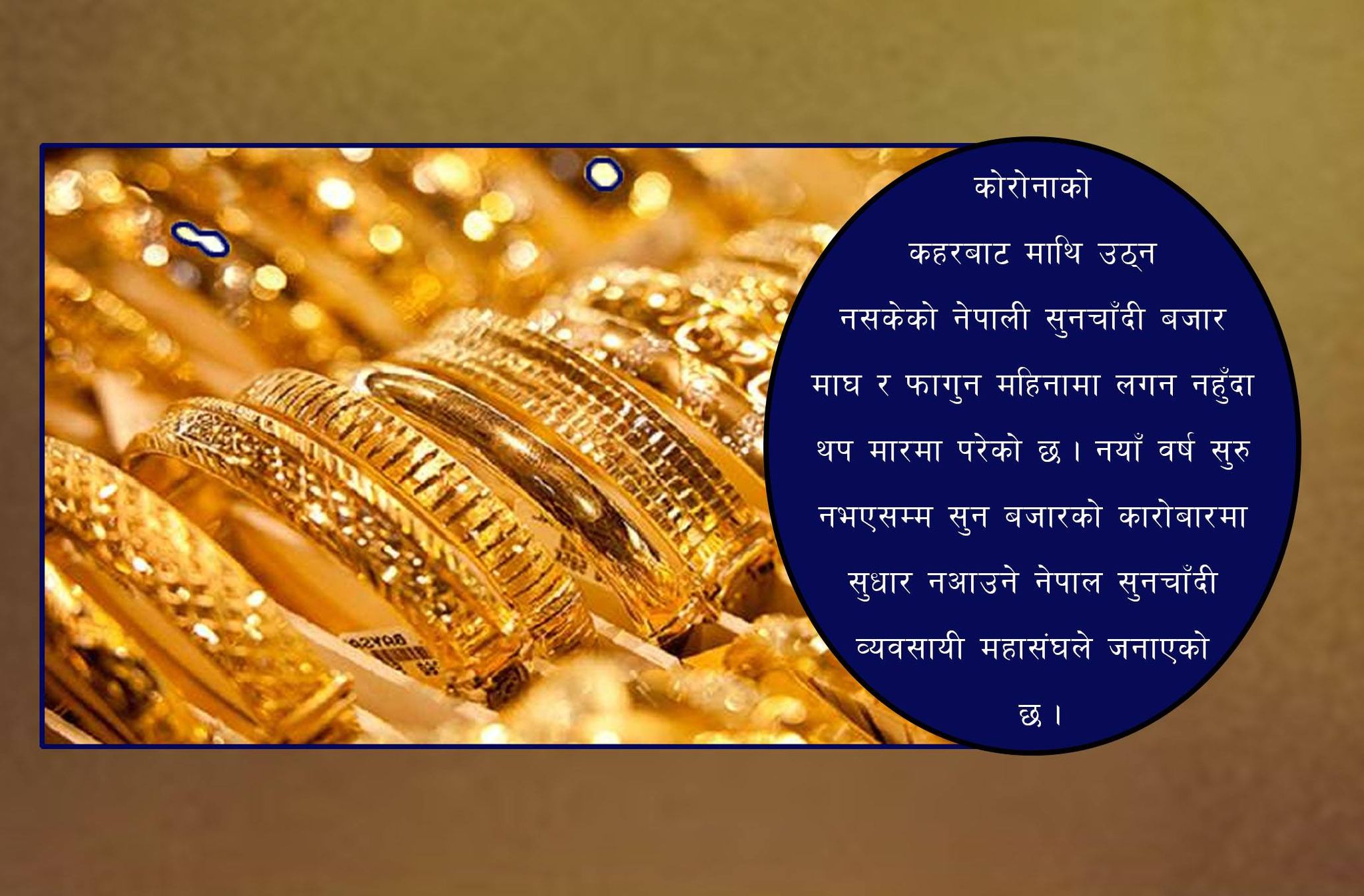कमला अर्याल /काठमाडौँ – सुनचाँदी बजारमा कोरोना भाइरसको असर अझै हटेको छैन । त्यसैमाथि विवाह व्रतबन्धजस्ता कार्यका लागि लगन हुने महिना माघ र फागुनमा लगन नभएपछि कारोबार थप प्रभावित भएको छ । व्यवसायीका अनुसार पुस महिना अफ सिजन भएकाले त्यसै कारोबारमा उत्साह आएन । माघमा पनि लगन नभएकाले कारोबार भएन । गत चैत्रदेखि भदौसम्म सुन बजार बन्दकै कारण ब्यापार भएन । असोजसम्मको डाटा हेर्दा असोज कार्तिक ताका केही मात्रामा मात्रै कारोबार भएको सुन बजार माघ र फागुनमा विवाहको लगन नहुँदा लगभग एक वर्ष जस्तै कारोबार प्रभावित भएको छ ।