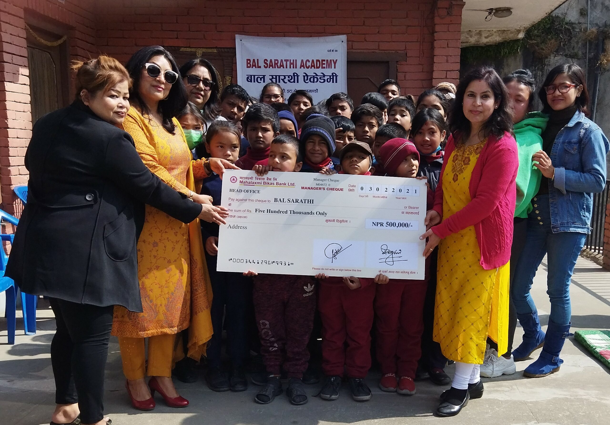 बिहीवार बाल सारथीको कार्यालयमा सम्पन्न कार्यक्रममा बैंकको बजार व्यवस्थापन विभागकी प्रमुख दिपान्जली खकुरेलले बाल सारथी संस्थाकी अध्यक्ष अस्मिता सुमार्गीलाई पाँच लाखको चेक हस्तान्तरण गरेकी थिइन् ।