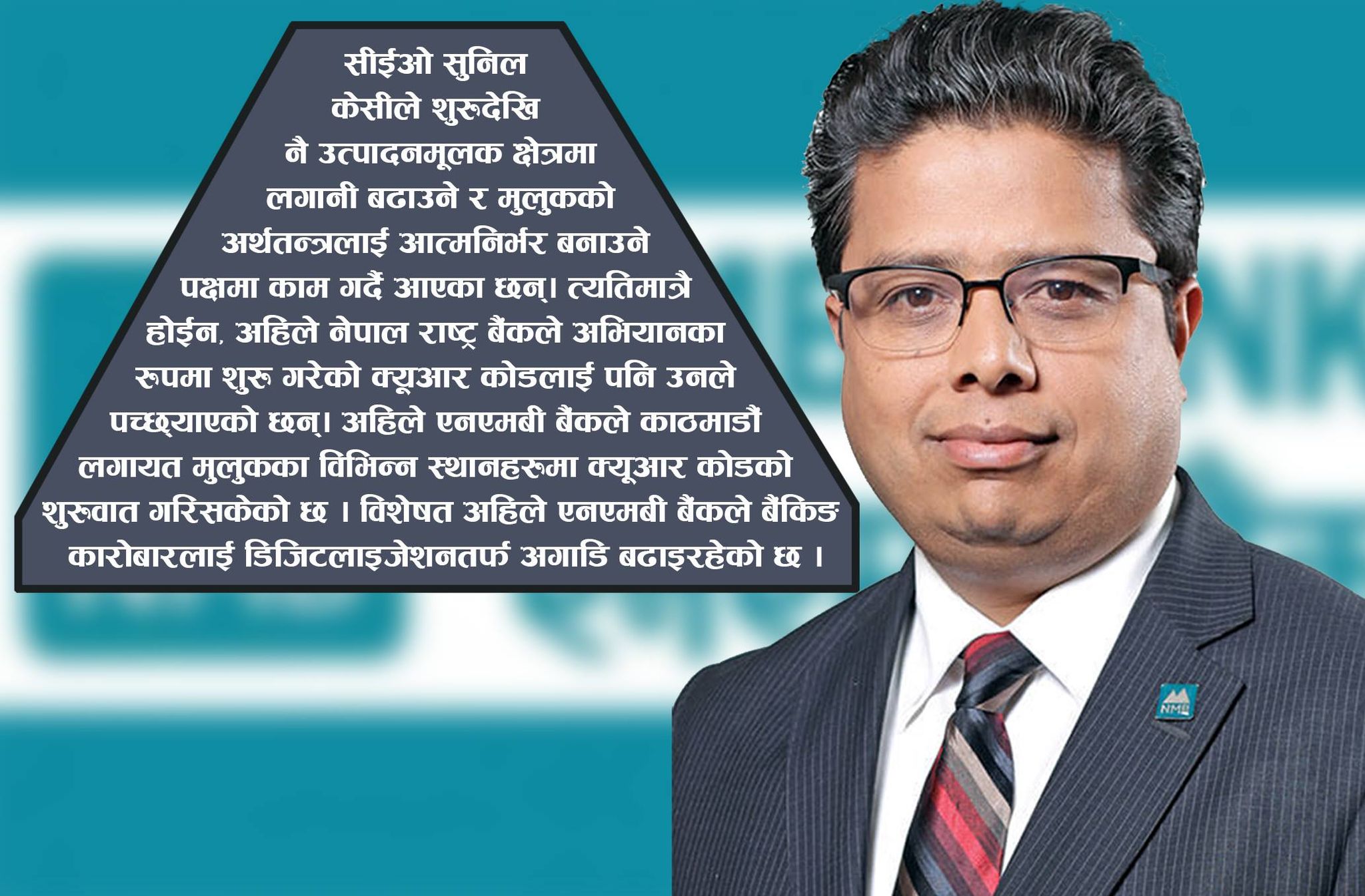 सीईओ केसीले शुरुदेखि नै भ्यालु एड बैंकिङको माध्यमबाट उत्पादनमूलक क्षेत्रमा लगानी बढाउउने र मुलुकको अर्थतन्त्रलाई आत्मनिर्भर बनाउने पक्षमा काम गर्दै आएका छन् । त्यतिमात्रै होइन, अहिले नेपाल राष्ट्र बैंकले अभियानका रुपमा सुरु गरेको क्यूआर कोडलाई पनि उनले पच्छ्एका छन् । अहिले एनएमबी बैंकले काठमाडौँ लगायत मुलुकका विभिन्न स्थानहरुमा क्यूआर कोडको शुरुवात गरिसकेको छ ।
