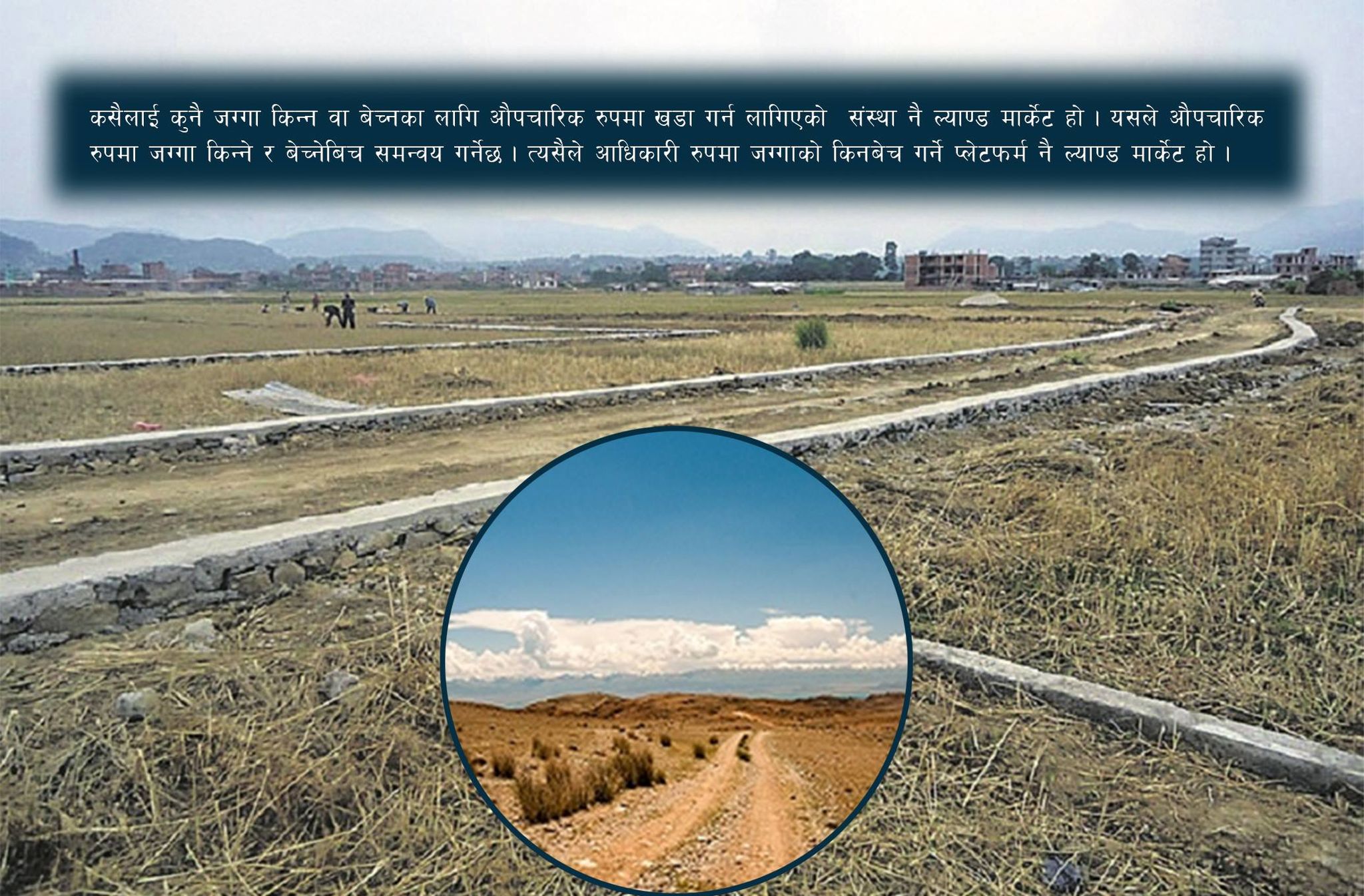 कसैलाई कुनै जग्गा किन्नु प-यो अर्थात् बेच्नुप-यो भने औपचारिक रुपमा खडा गर्न लागिएको संस्था हो, ल्याण्ड मार्केट। ‘जग्गा कारोबारका लागि फर्मल खालको संस्थाको स्थापना गर्न खोजिएको हो ।’ प्रवक्ता जोशीले भने । यसले औपचारिक रुपमा जग्गा किन्ने र बेच्नेबिच समन्वय गर्नेछ । त्यसैले आधिकारी रुपमा जग्गाका किनबेच गर्ने एउटा प्लेटफर्म नै ल्याण्ड मार्केट हो ।